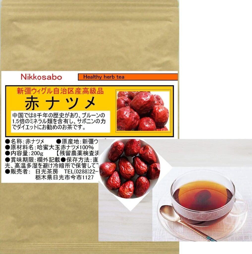 ナツメを煮出した甘いお茶。貧血や不眠改善に良いとされ、ティーバッグや蜂蜜漬けが市販品で入手可能。